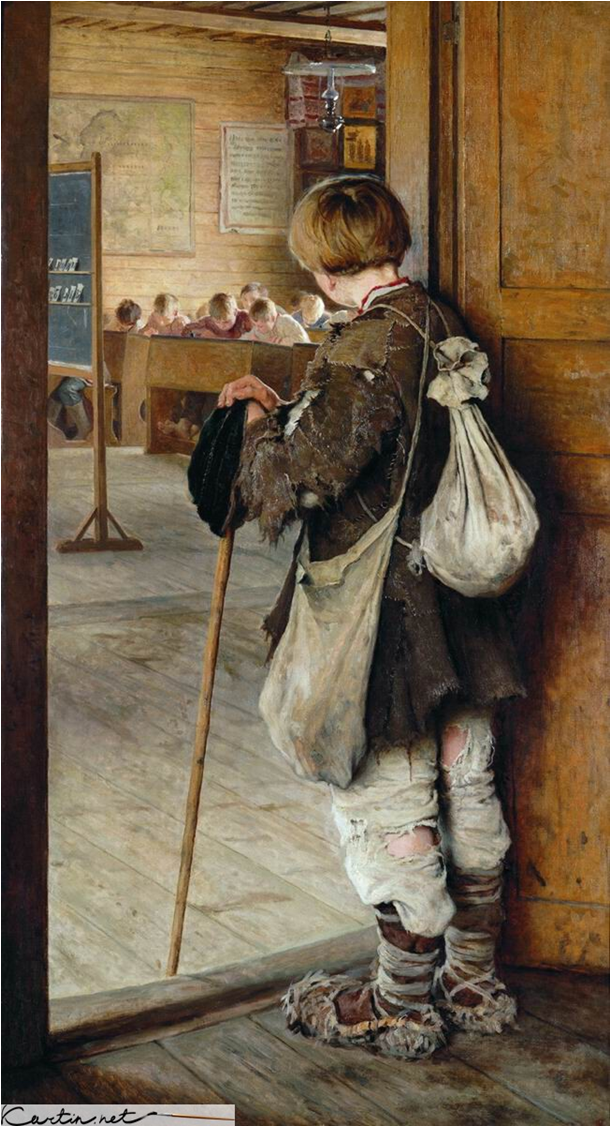 Петрович «У дверей школы», 1897.Какие строки из произведений Н.А. Некрасова подходит к репродукции картины русского художника?